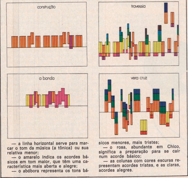 “Pode-se ver como Chico emprega muitos acordes preparatórios, em cor rosa no gráfico, seguindo a harmonia barroca, bastante usada na música popular, pouco usada na música erudita do século XX e totalmente ausente do jazz. Nela, o acorde preparatório quase obriga ao acorde seguinte, criando uma tensão que leva a uma solução harmônica lógica, caindo no acorde principal, a tônica. Os acordes empregados são os básicos, sem nenhuma nota dissonante.”