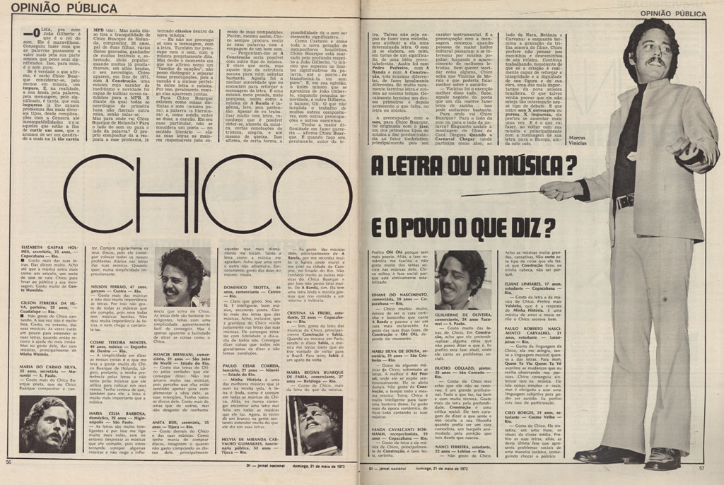 VINICIUS, Marcos. Chico Buarque – A letra ou a música? E o povo, o que diz?. Revista Domingo (p. 56-57), Ano 1, Nº 44, 1972. Disponível em: https://www.jobim.org/chico/handle/2010.2/211#. Acesso em: 16 de maio de 2025.