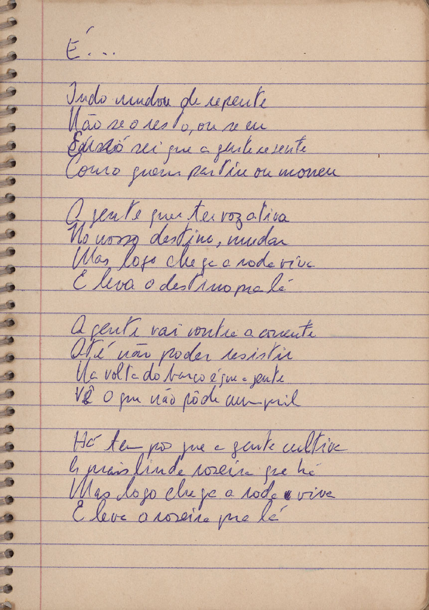 “A composição é um ofício muito solitário, é uma coisa que sai de repente, de dentro de você, quando você está com você mesmo. Se eu fizesse músicas de outro modo, eu seria o quê? Um compositor de protesto? Eu não sou um compositor de protesto. Não sei bem o que é ser um compositor de protesto. Não faz muito sentido pra mim. Pode ser que eu seja uma pessoa de protesto. Pela carga que há em cima de mim. Mas não é uma atitude minha. As pessoas falam das minhas músicas censuradas. O que será que as pessoas imaginam que há nas minhas músicas censuradas? Muitas vezes não tem nada, há canções de amor, há brincadeiras, coisas que empacam por bobagens, que não têm nada a ver.”